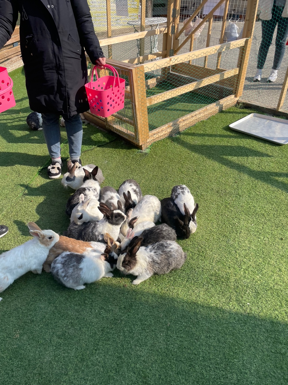 토끼들이 지내는 우리안에 직접 들어가서 입장할 때 받은 사료 바구니에서 토끼사료를 줄 수 있습니다.