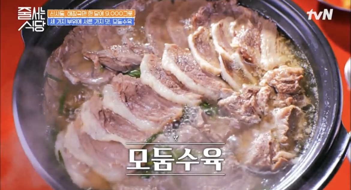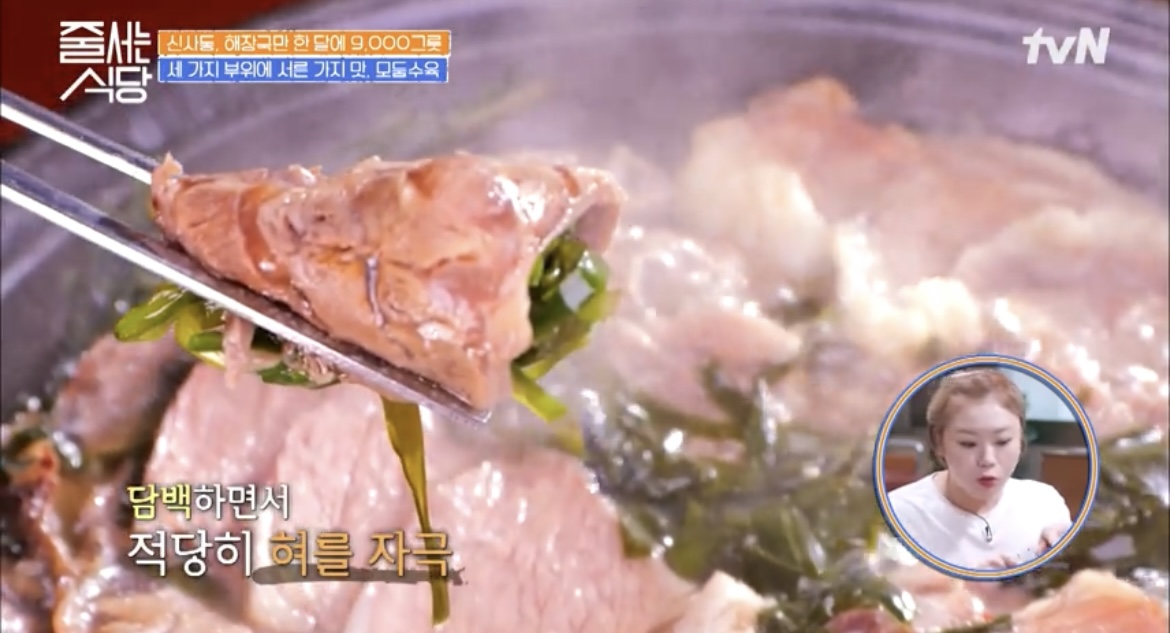 2022년 7월 11일 줄서는 식당에서는 박나래, 입짧은 햇님, 권율이 추천하는 압구정 신사동의 해장국 줄식당을 방문합니다. 하늘도 도와주지 않은 날씨에 기나긴 웨이팅은 몹시 지쳤지만, 고생끝에 낙이라고 기나긴 웨이팅 끝에 맛본 이집의 시그니처 아롱사태,소갈비살, 차돌박이 등 고기를 푹삶은 모듬수육과 살짝 맛있게 맵지만, 무의 달달함을 그대로 느낄 수 있는 특해장국( 차돌,갈비살,아롱상태가 섞여 들어감) 에 낚지볶음 은 황홀 그자체였다고 말한 식당을 찾아보았습니다.