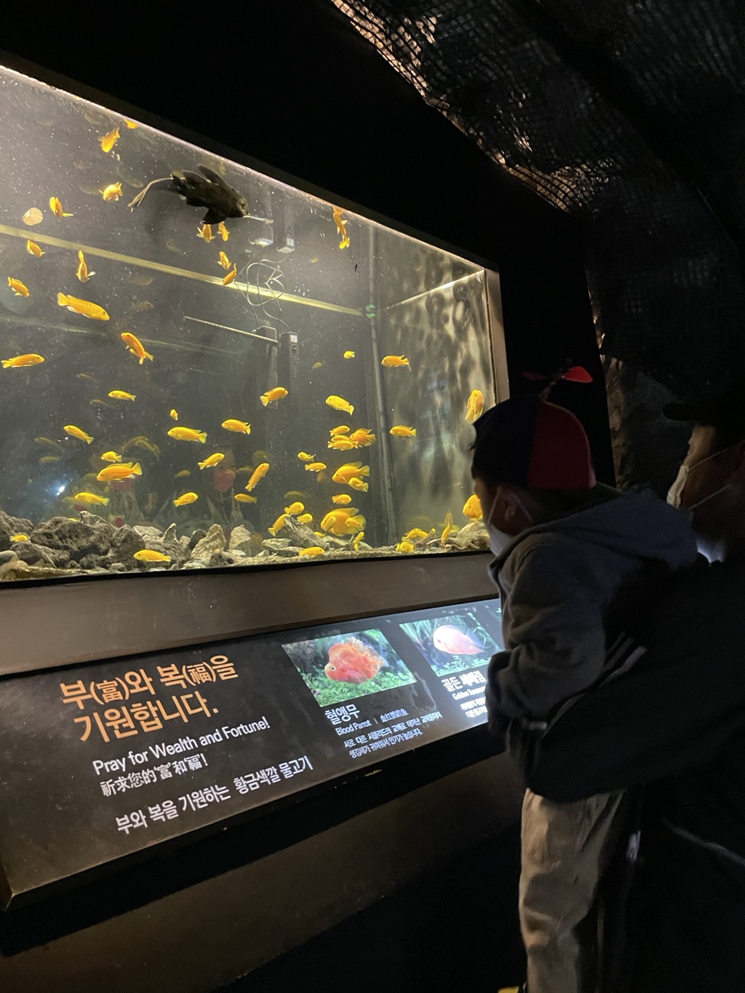 종류는 많지 않지만 , 복의 기운의 황금 물고기 등을 관찰할 수 있어요. 작지만 알찬 아쿠아 월드였습니다.