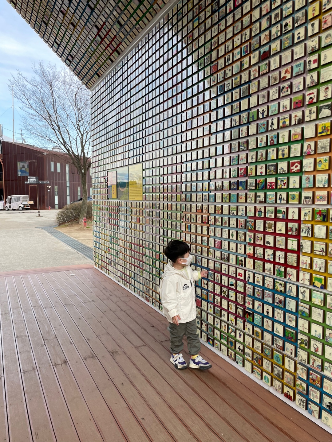 남한과 북한을 잇는 다리를 염원하며 만든 '꿈의 다리' 라는 작품도 있었습니다. 집 모양의 구조물이 알록달록한 모습을 하고 있어 멀리서도 눈에 딱 띄었습니다. 바깥쪽에는 민요 아리랑 가사와 소재로 한 아리랑 연작들로 꾸며져 있었고 안쪽으로는 초등학생들의 염원과 마음을 담아 그린 그림타일들로 꾸며져 있었습니다.