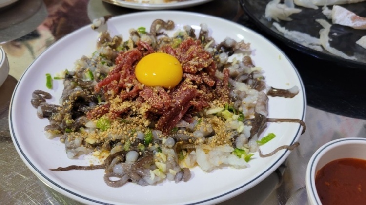 육회탕탕이에 꽃인 달걀노른자와 폭탄 달걀찜에 산낙지를 투하하면 어떤 맛이 날까요?