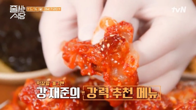 강재준의 강력추천메뉴 양념게장비빔밥. 커다란 접시에 밥과 양념게장이 올려진 메뉴로 양념게장을 따로 먹을 수도 있고 함께 비벼 먹을수도 있다고 합니다.