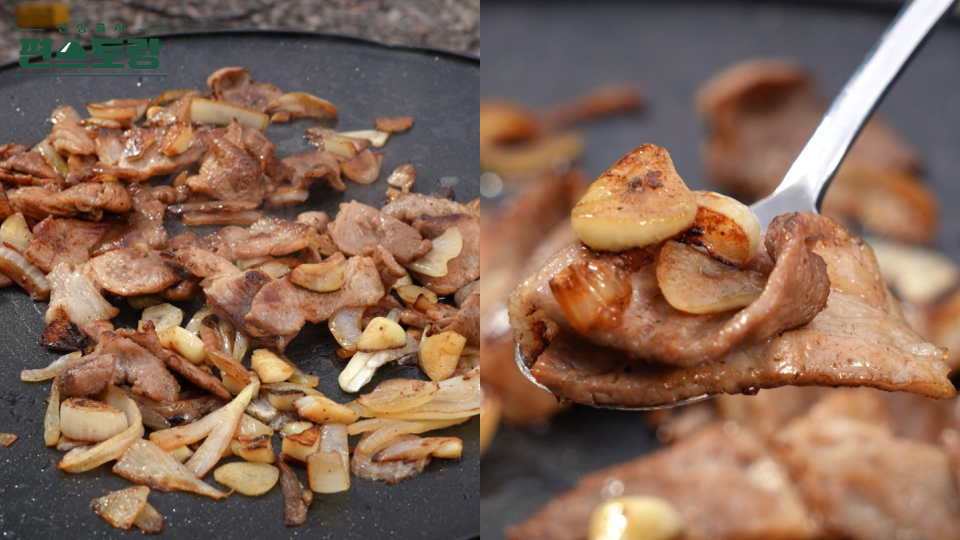 4. 달군 팬에 재운 앞다릿살과 마늘을 넣고 중불에 노릇하게 구워주면 완성!