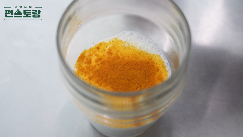 1. 우유 200ml에 강황가루 1t, 계피 1/2t를 넣고 잘 섞어준다.